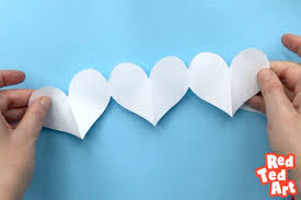 Cut out a heart shape through the layers, so that you will end up with five identical paper or card hearts. Fold a piece of colored paper (8.5 x 11) in half, then glue your heart template to it. For a sturdier card, print the card. You can fold it first, then cut. Fold the white square paper (11 x 11 cm) diagonally and draw one side of a heart as shown below.